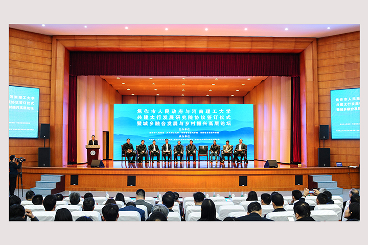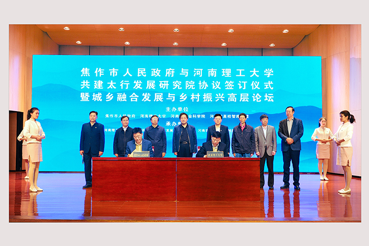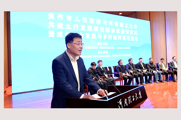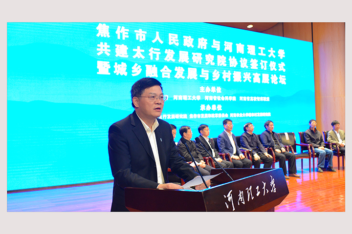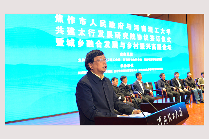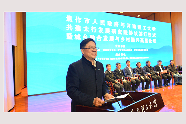4月20日,焦作市人民政府与河南理工大学共建太行发展研究院协议签订仪式暨城乡融合发展与乡村振兴高层论坛在学校明德楼一楼音乐厅举行。省委高校工委专职委员高治军、省人大常委会财经工作委员会副主任张玉民,焦作市副市长薛志杰,省社科联党组成员、机关党委书记王喜成,省自然资源厅总规划师雷子平,中国(河南)创新发展研究院院长、省高校智库联盟理事长喻新安,河南农业大学新农村发展研究院院长、省高校智库联盟副理事长程传兴,校党委书记邹友峰、校长杨小林出席。省内外高校、科研院所的著名专家学者,市直有关单位、学校相关职能部门负责同志,相关学院师生代表参加了仪式。仪式由副校长、太行发展研究院常务副院长张锟主持。