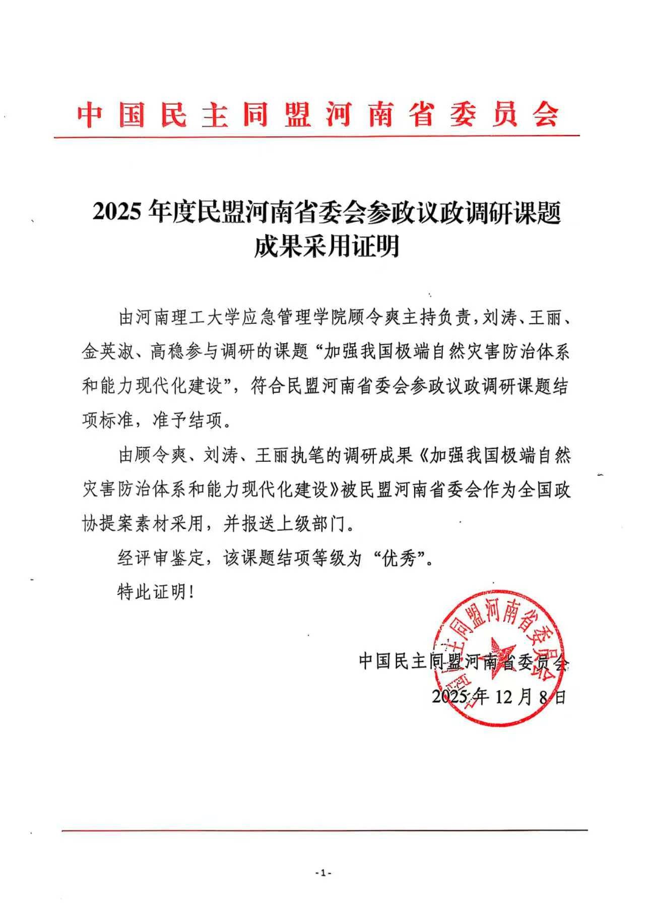 近日,民盟河南省委会决定对2025年度75篇参政议政优秀成果予以通报表彰。经评选,我校教师顾令爽、金英淑与研究生高稳撰写的《关于加强我国极端自然灾害防治体系和能力现代化建设的建议》调研报告被民盟河南省委会采用,并作为全国政协十四届四次会议提案素材提交民盟中央。